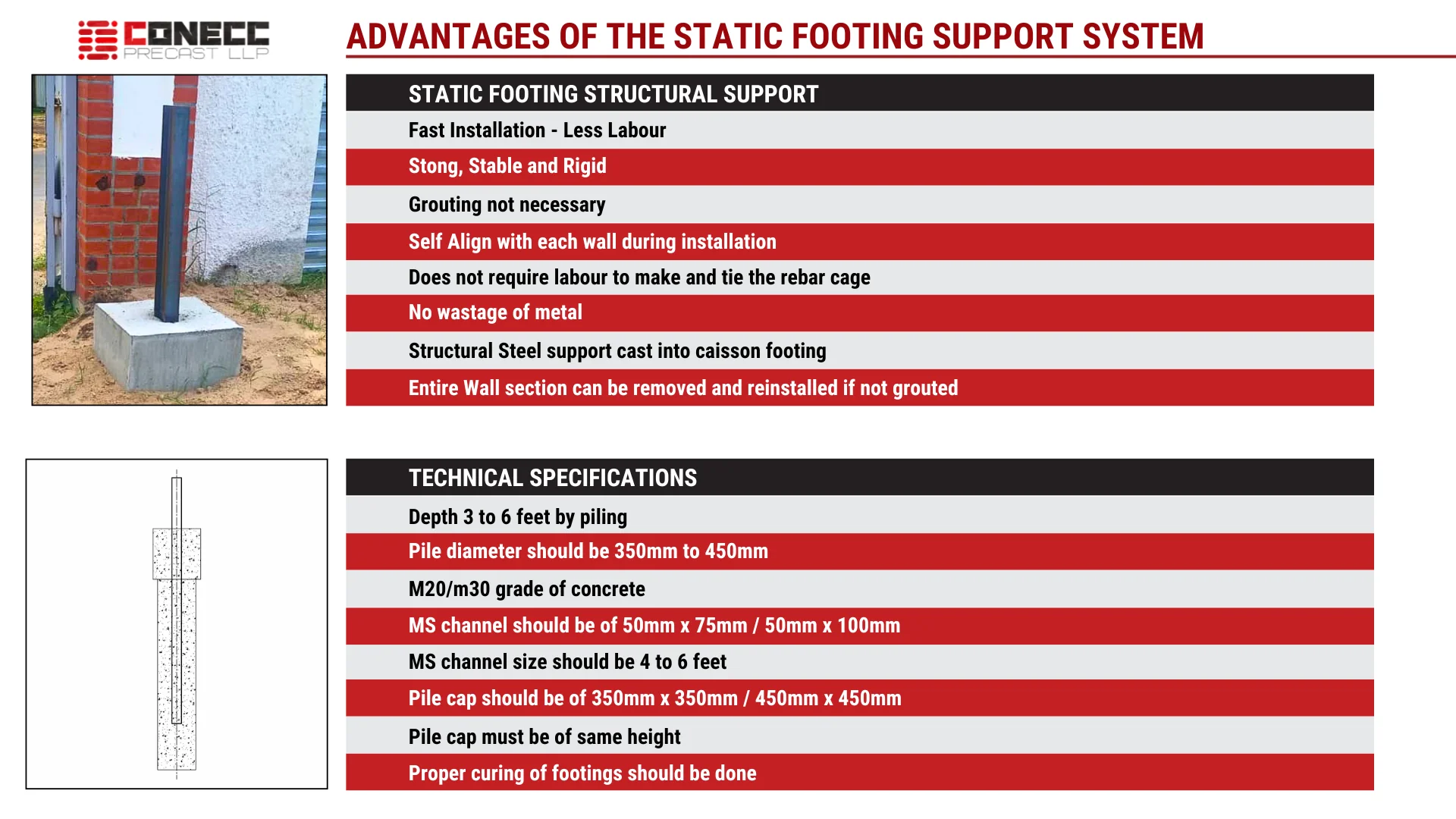 The form texture look on both sides of the wall has been introduced for the first time in India by Conecc Precast. With the Uni-Cast System included with Connec walls, the column and panel are cast as a single, connected piece. We were the first in India to introduce the Static Footing support system, which gives the panels safe, quick, and secure support after installation.